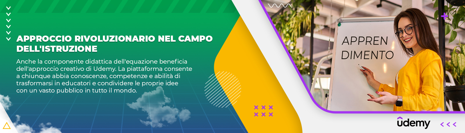 Anche la componente didattica dell'equazione beneficia dell'approccio creativo di Udemy. La piattaforma consente a chiunque abbia conoscenze, competenze e abilità di trasformarsi in educatori e condividere le proprie idee con un vasto pubblico in tutto il mondo. Con la democratizzazione dell'istruzione, professionisti dedicati provenienti da molti background ora hanno nuove entusiasmanti possibilità di interagire con studenti di tutto il mondo.