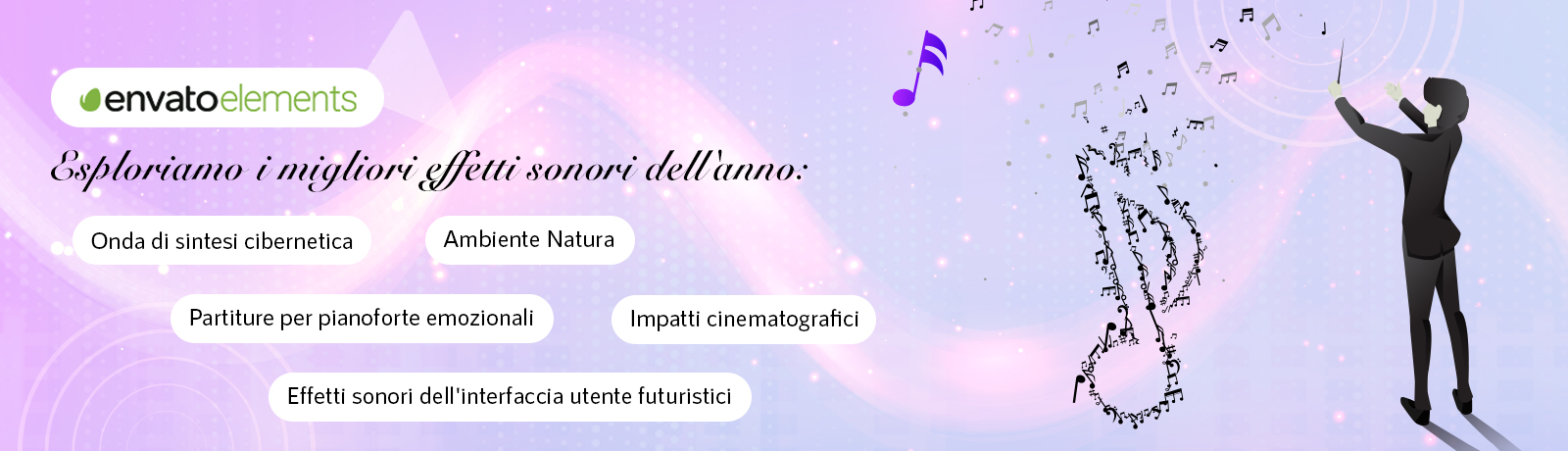 Nel mondo del marchio sonoro, creare un paesaggio sonoro del marchio è come comporre una sinfonia emotiva. È un abile processo di combinazione e abbinamento, in cui ogni elemento si unisce per raccontare una storia potente. Entra in Envato Elements, il maestro guida che conduce le aziende in un mondo di accattivanti effetti sonori, perfettamente in linea con il loro marchio.