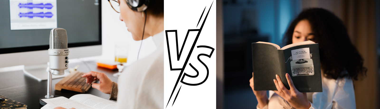 Gli audiolibri sono un modo più veloce di leggere; puoi regolare la velocità mentre ascolti i libri. Tradizionalmente leggere libri aiuta a migliorare la memoria e la ritenzione e la concentrazione della persona che legge. La battaglia tra i due su quale sia il migliore non può mai finire, e non c'è nemmeno una conclusione. Poiché ognuno ha percezioni e pensieri diversi al riguardo. Entrambi hanno pro e contro; dichiarare quale sia il migliore non è giusto. Ad alcuni piace leggere libri pagina per pagina e ottenere la migliore esperienza durante la lettura, mentre ad altri piacciono gli audiolibri. Ascoltare i libri li fa sentire più a loro agio e gioiosi mentre svolgono contemporaneamente altri compiti, come ascoltare i libri e rompere gli occhi. Entrambi sono in piedi al loro posto.